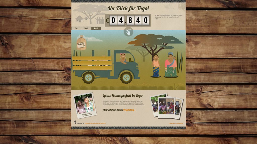 Wir haben uns für einen responsive Scrollytelling-Ansatz entschieden, bei dem die Geschichte von den Frauen aus Togo in drei Animationen erzählt wird. Die Animationen bewegen sich, wenn der Besucher der Seite scrollt. Die Webseite haben wir dann noch mit einem Spendenportal integriert, so dass alle Spenden direkt an die Initiative gehen.
