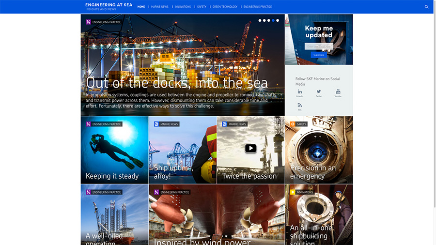 Es sollte ein Content-Hub entwickelt werden, mit dem SKF Marine mit Ihrer Zielgruppe in Kontakt bleiben kann. Der Content-Hub soll dazu durch interessante Inhalte, ein ansprechendes modernes Design, spannende Inhalte und bidirektionale Kommunikation punkten.
